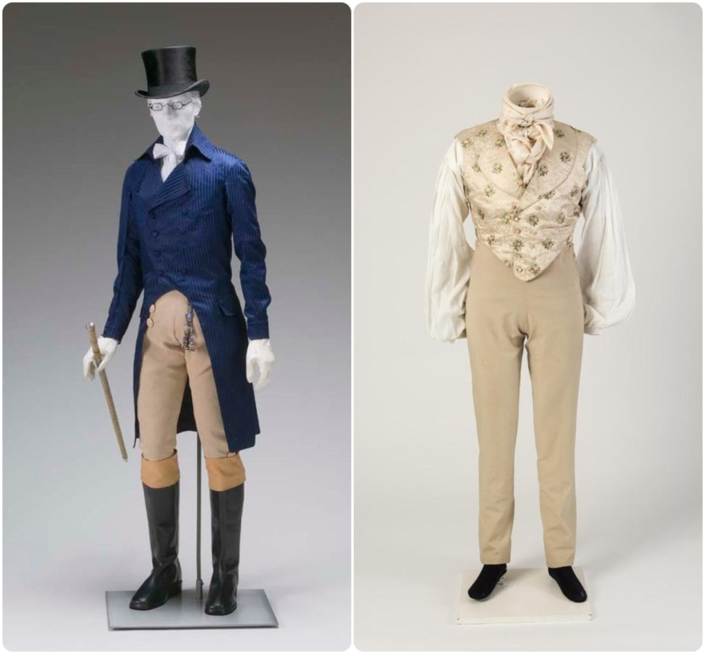 Meanwhile Andresh would wear clothes like these (although he wouldn’t wear all tan and cream like the outfit on the right). The outfit on the left dates 1810-1815, so a little old-fashioned, and the outfit on the right is from the 1820s. The outfit from the left is from the Mint Museum, and the right is from the Fashion Museum of Bath.