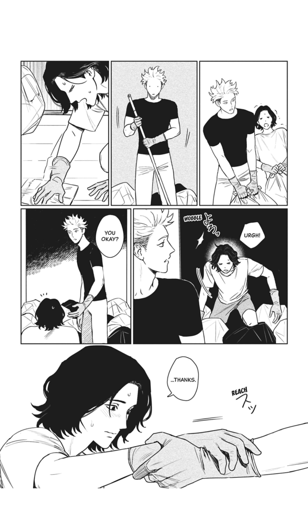 It turns out Katsuyoshi is the neighbor below. He sees Kamakura’s living conditions and offers to help him clean, especially with the threat of eviction from the landlord, and Kamakura reluctantly agrees. What challenges Kamakura even more is that during the cleaning process, he stays overnight with Katsuyoshi at his apartment, and the two form a special bond with each other that goes beyond their individual traumas.