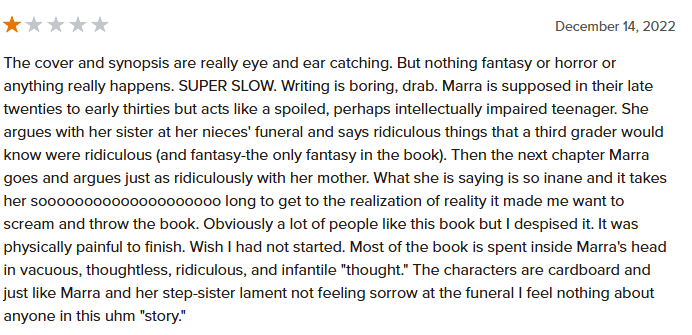 I actually really love this book. It made T. Kingfisher an auto-read for me. I thought this was dark and whimsical at the same time, full of original ideas and humor amid some very serious, traumatic things. I didn’t have any issues with the characters, although I did sometimes forget the lead is supposed to be 30 years old. But that was no dealbreaker for me. I enjoyed myself throughout the book.