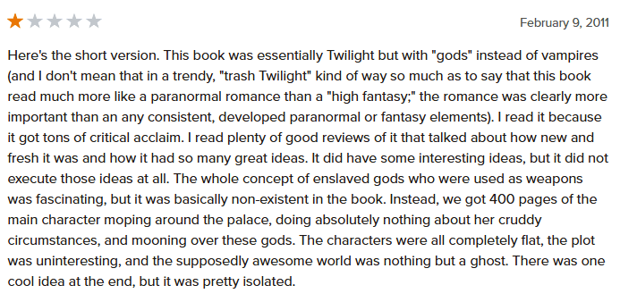 At the time of writing this, the only book I have out is Son of the Siren, which has garnered two-star reviews, but no one-star. I consider myself lucky, but I’m also expecting to get one eventually. And if not with Son of the Siren, with The Name and the Key trilogy. I look at these one-star reviews to make myself feel better–even the best books out there are disliked, which has nothing to do with the quality of books, but rather, a reader’s opinion. I hope this adds a layer of strength to me for when the time comes when I get one-starred reviews.