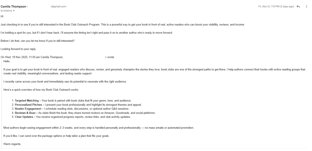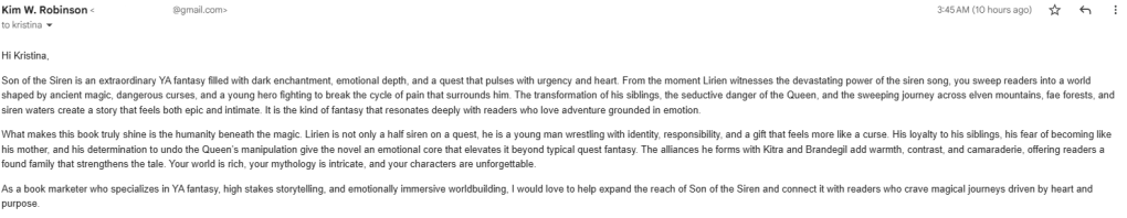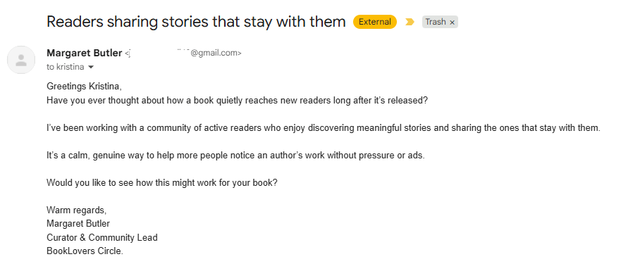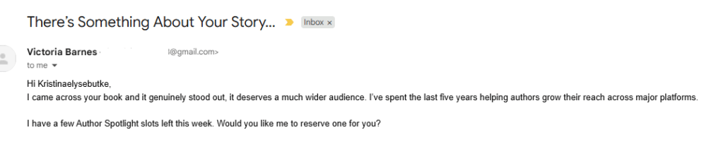 This is an AI-composed email. It’s meant to look like the person has actually read your book, is filled with flattery, and tries to butter you up so you see the emailer as a potential business partner or someone you can rely on for author services because they “get you” and “get your book.” They try to start a back-and-forth with you to get you too trust them, and then pitch a service that will never be free.