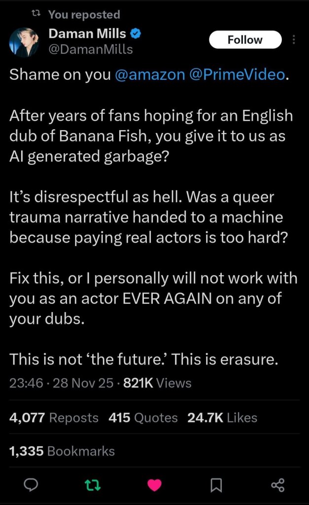 If you have been keeping up with this blog, why, just a few days ago I posted a rant about the hideous AI dub of Banana Fish and the implications of using AI. I wasn’t the only one to voice my concerns to the internet. Voice actor Daman Mills, who I previously said would make a great Ash, let his feelings be known, too: