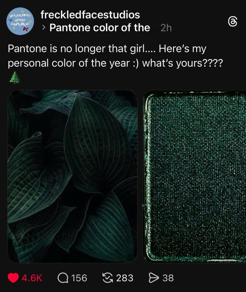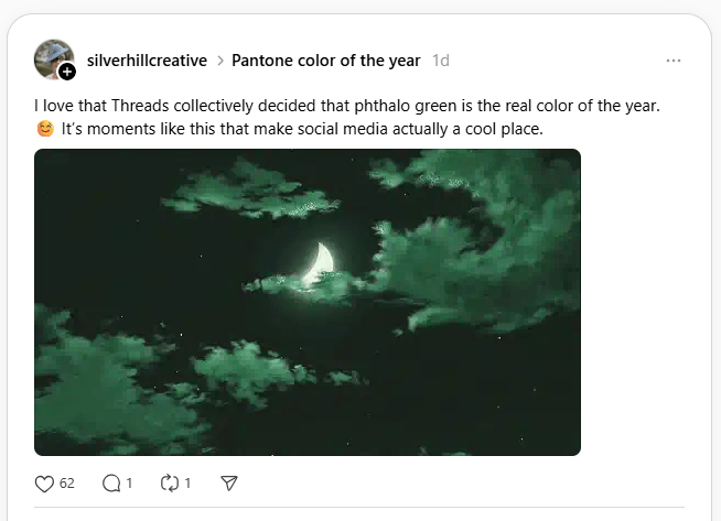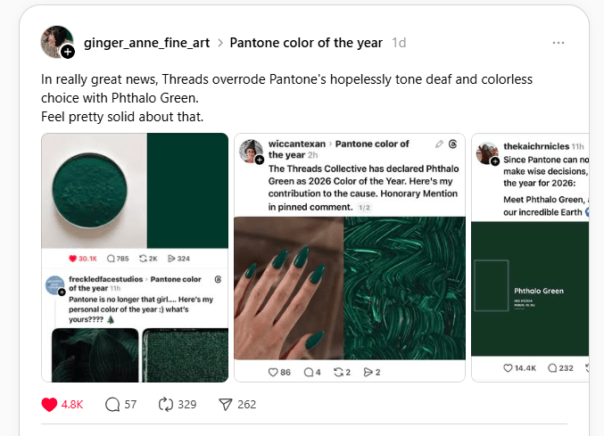 What’s social media going to do? Why, pick a new color, of course! And it seems unanimous, at least on Threads, that the 2026 color should be Phthalo Green.
