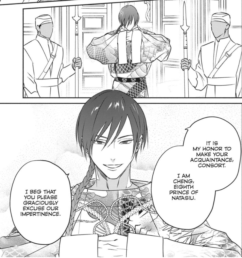 In the above picture, Ilia is wearing copious amounts of jewelry, and a heavily decorated collar on his neck. Omegas have a religious significance and are well-respected in Hanu, so Ilia’s finery reflects how he is to be treated. Notably the collar on the neck is a fancier version of many of the collars you see Omegas wear in other Omegaverse manga; this is designed to protect the Omega’s nape until the time comes for an Alpha to bite it and make an official pairing. In Hanu, this collar is also a status symbol.