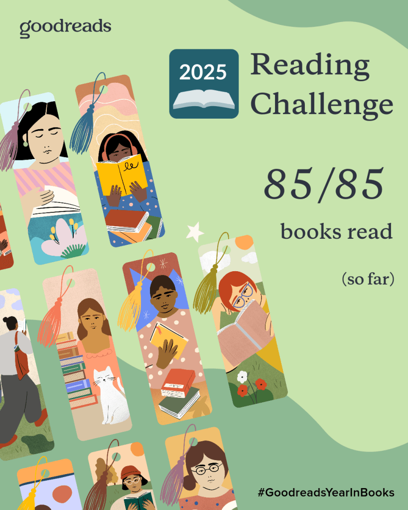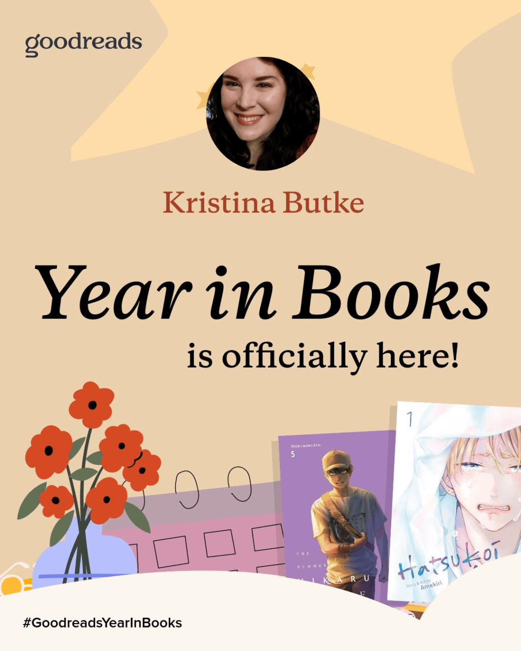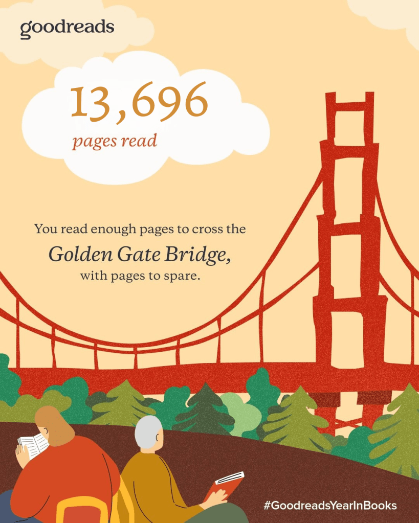 I figured out how to do a little bit of editing in Canva to update my numbers. It recorded old data for my number of books completed, as well as my page numbers and reading challenge total. But I didn’t want to mess with things too much. My favorite part about Goodreads gathering data on your reading is not the giant graphic web page they make (although that’s fun to look at), but rather the custom-made emails with the art included (as shown above).