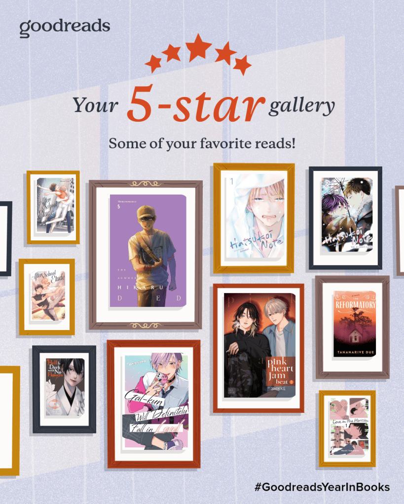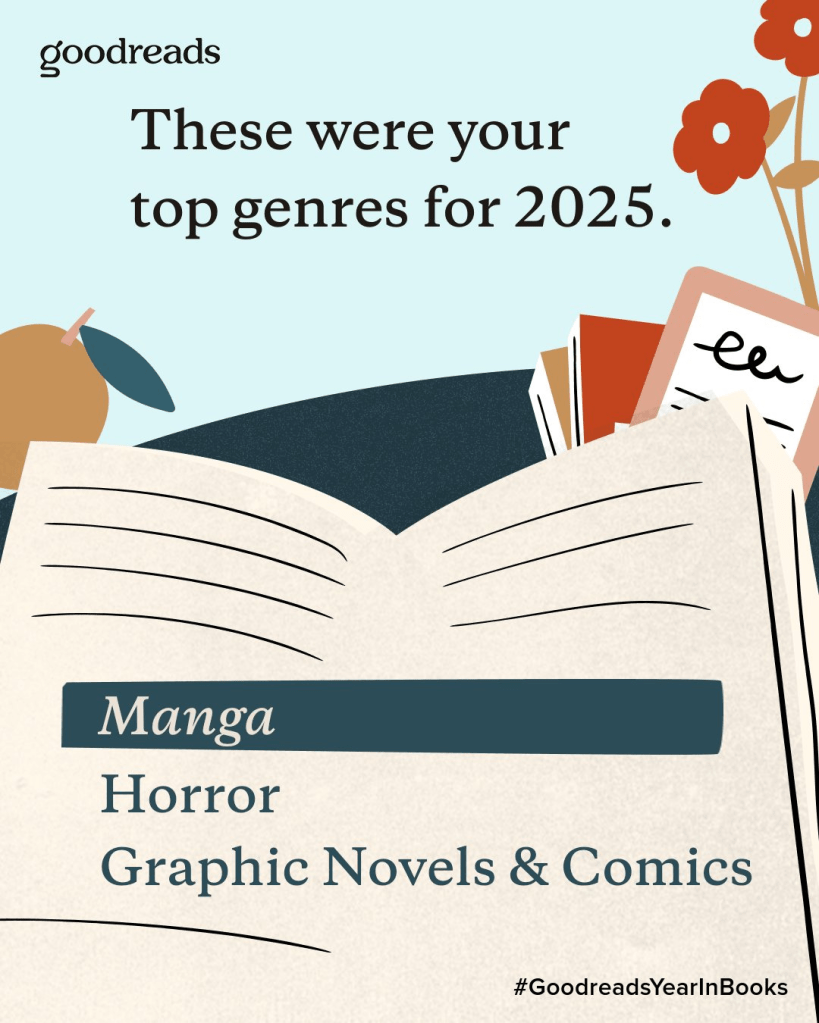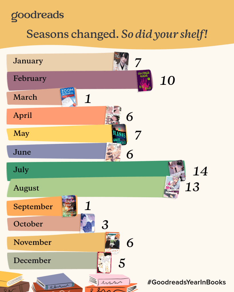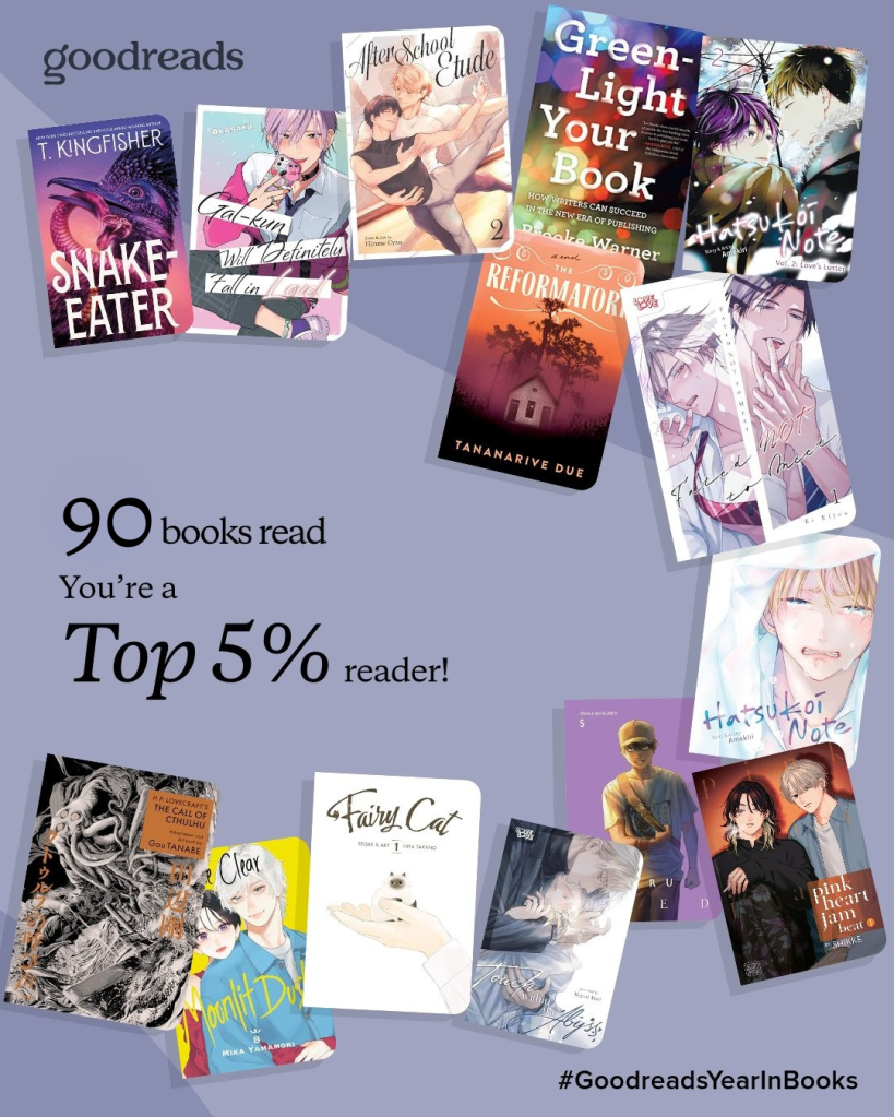 I figured out how to do a little bit of editing in Canva to update my numbers. It recorded old data for my number of books completed, as well as my page numbers and reading challenge total. But I didn’t want to mess with things too much. My favorite part about Goodreads gathering data on your reading is not the giant graphic web page they make (although that’s fun to look at), but rather the custom-made emails with the art included (as shown above).