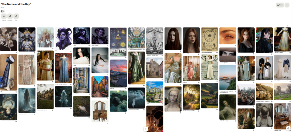 While I have created separate mood boards for The Name and the Key, Pinterest has been an ancient go-to, where I created my first image boards ever. I created one back in the 2010-2013 era for the graduate thesis version of The Name and the Key, but that changed enough that most of the pins no longer applied, and I deleted it ages ago.