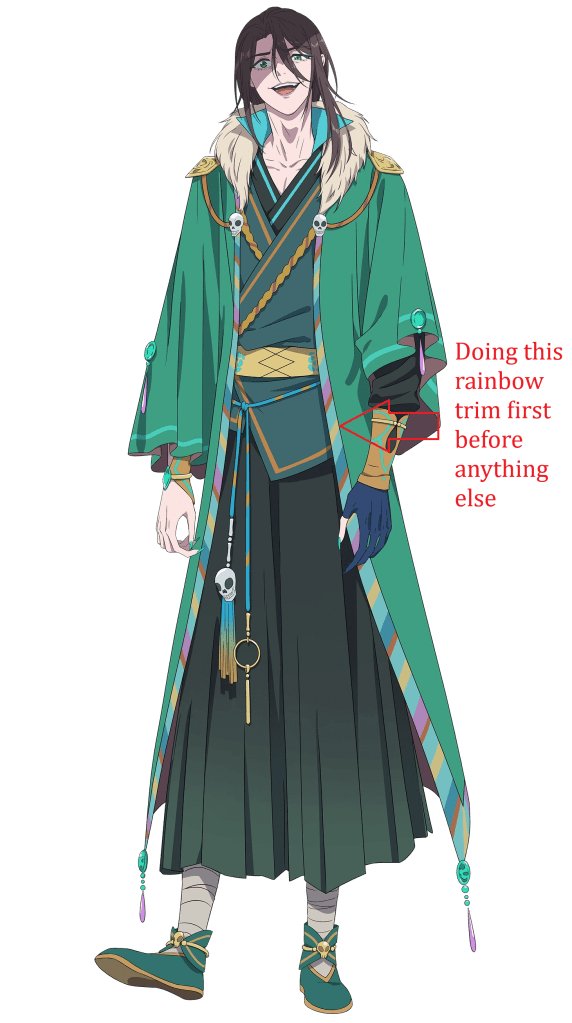 Then I started sewing. I mentioned in this post that the summer of 2025 I decided I wanted to cosplay Qi Rong from Heaven Official’s Blessing (the donghua, not the novel or manhua). He’s a despicable, over-the-top character and I don’t really like him–although sometimes he’s funny. Rather, I chose him because I never see him cosplayed, and he has a really unique style. Compared to Hua Cheng, who I someday really want to cosplay, his costuming seems much easier for me to make.