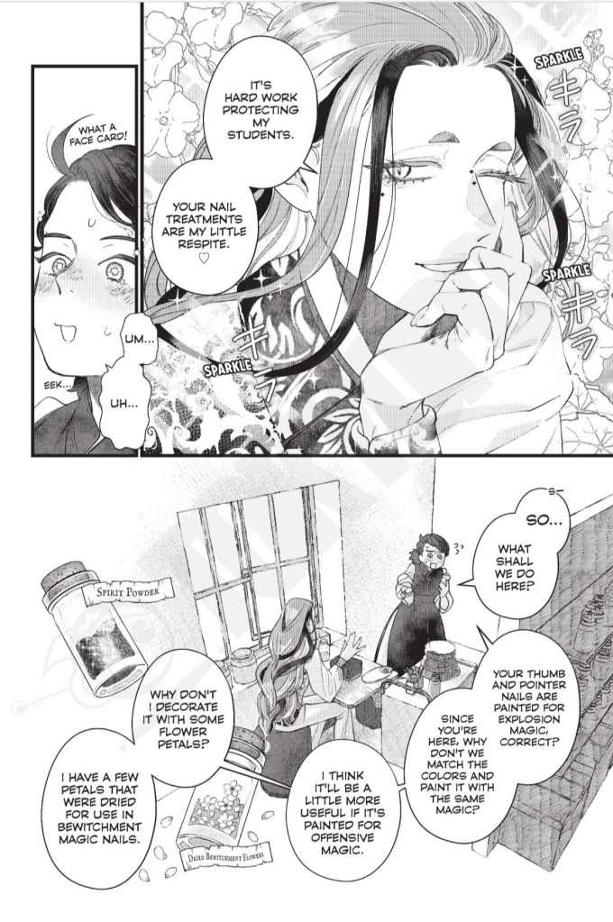 The big thing to understand is the magic system. Wizards have their nails painted and decorated, and these polishes and decorations are imbued with magic they are able to channel with their fingers. If you paint someone’s nails red and then glue tiny pieces of dragon scales to decorate the nail, wham! They can summon fire by making a gesture with their finger or hand (this is just an example; I think it came from my head and not the manga). You can put different types of magic in each nail for a varied magical attack. I never thought something like this would be all that interesting, but the manga very much makes it so!