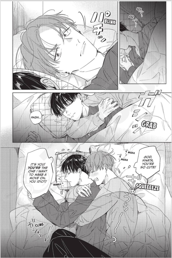 Hinata reluctantly agrees, and my favorite romantic trope, ONLY ONE BED, makes its first appearance in the manga! There is no second futon, and while one of the men could sleep on the couch, Toki is insistent they share a bed, and that (through actions, not words) Hinata be his pillow.
