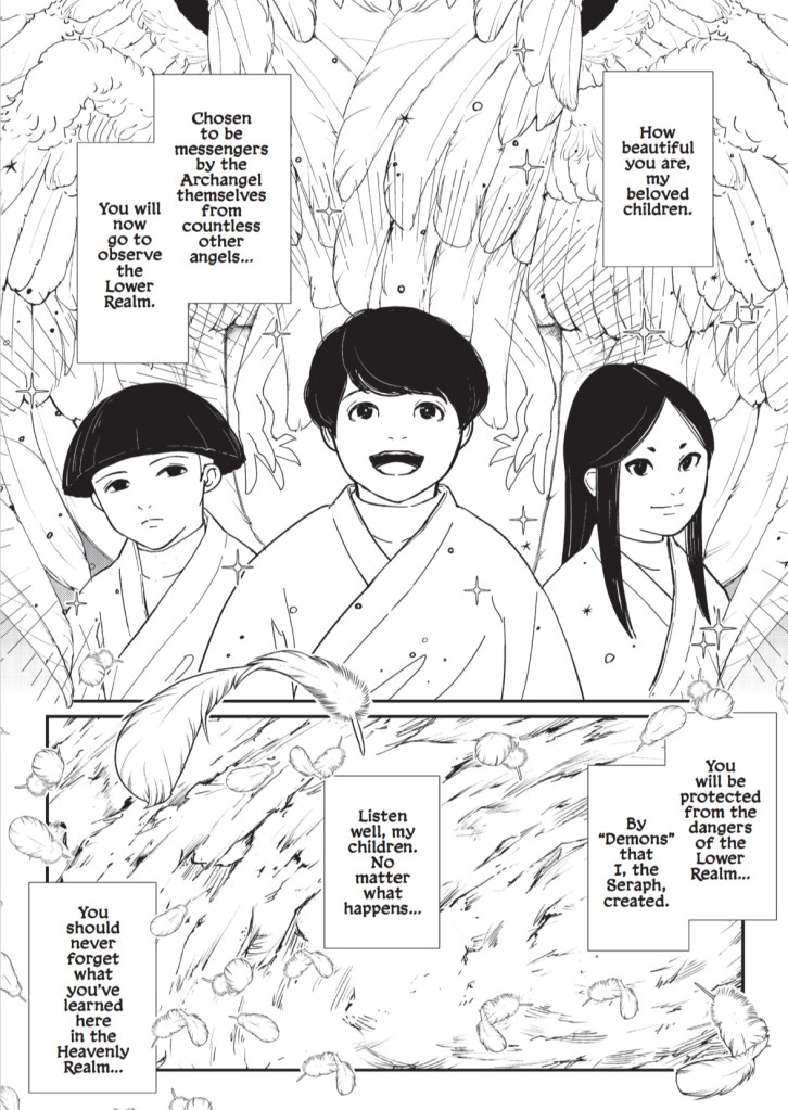 Anyway, the angel-children set out to explore the vast expanse on which they’ve landed, demon guards in tow, and we slowly get more details about the worldbuilding, particularly the three realms (Heaven, the lower realm, and the realm at the bottom of the Earth), a strange seven-day storm, and other mythology that makes for an interesting tale.