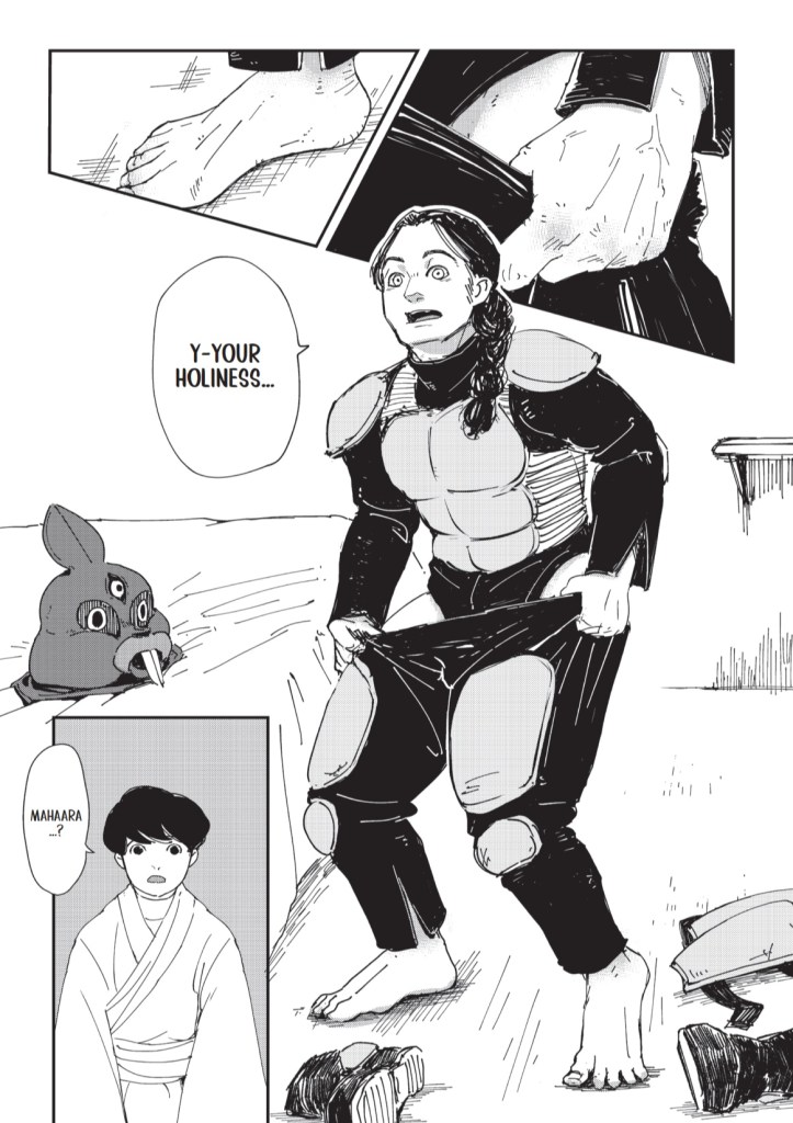 Dori takes to this “new” Mahaara well, and they form a sort of taboo friendship, and Dori vows to keep Mahaara’s true form a secret. But they dance around what Mahaara actually is–Dori remarks that Mahaara looks “the same” as he does without the costume and mask, and Mahaara replies, “By no means! We can’t possibly be similar! We are nothing like you, your holiness.” Smells like a mystery to me. If not human, why human-shaped? And of course, the angels seem human too, as we haven’t glimpsed anything supernatural come from them yet.